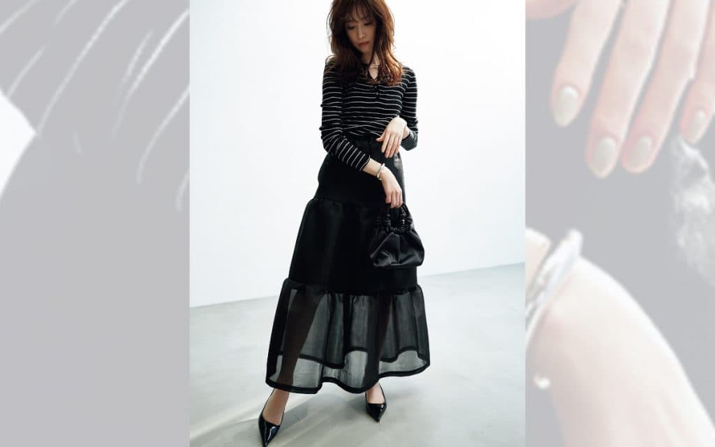Юбка - 38 500 руб. (Alpinisme Lokit), свитер - 13 200 руб. (MIESROHE), сумка - 19 800 руб. (S & T Visque), обувь - 53 900 руб. (Pellico, Ginza Six), ожерелье - 132 000 руб. (Brani Iris Tokyo), браслет - 13 750 руб. (Fourteen Showroom H)